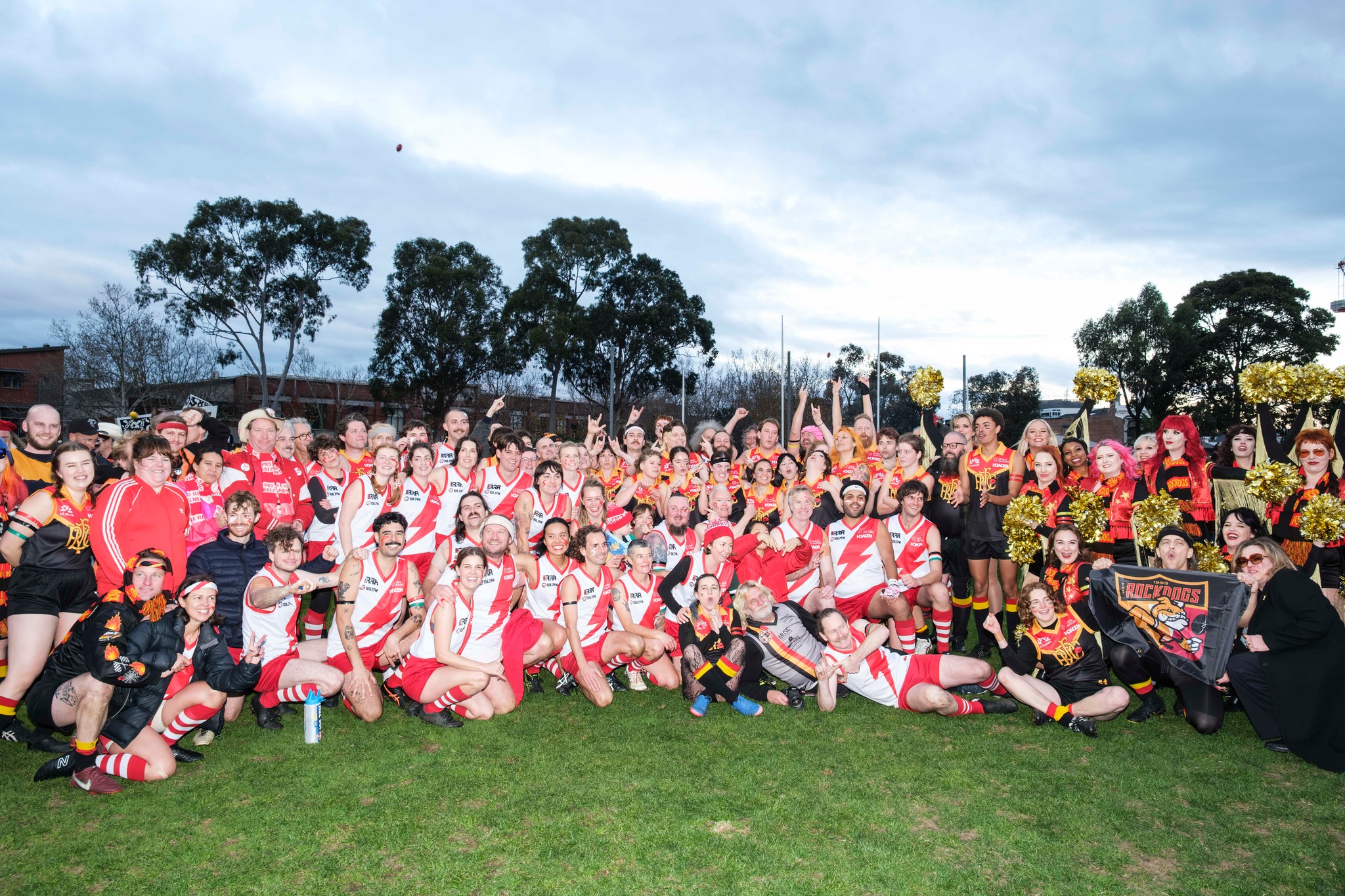 On ground, the Megahertz are identified by their red and white guernseys whilst the Rockdogs wear black, red and yellow. The Rockdogs where created as a social football team in 1990, known as the Espy Rockdogs they played against Chasers before forming a charity football match against The Totel Hotel in 1993 and raising $500.